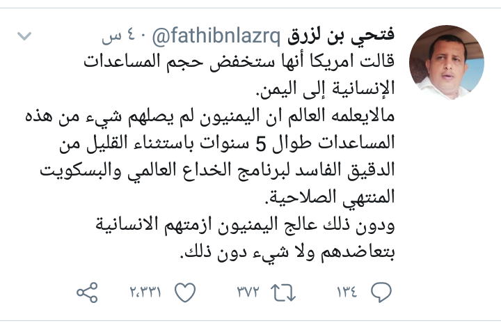 وقال بن لزرق في تغريدته على تويتر: قالت أمريكا أنها ستخفض حجم المساعدات الإنسانية إلى اليمن، ما لايعلمه العالم أن اليمنيون لم يصلهم شيء من هذه المساعدات طوال خمس سنوات باستثناء القليل من الدقيق الفاسد لبرنامج الخداع العالمي والبسكويت المنتهي الصلاحية ودون ذلك عالج اليمنيون أزمتهم الإنسانية بتعاضدهم ولا شيء دون ذلك.