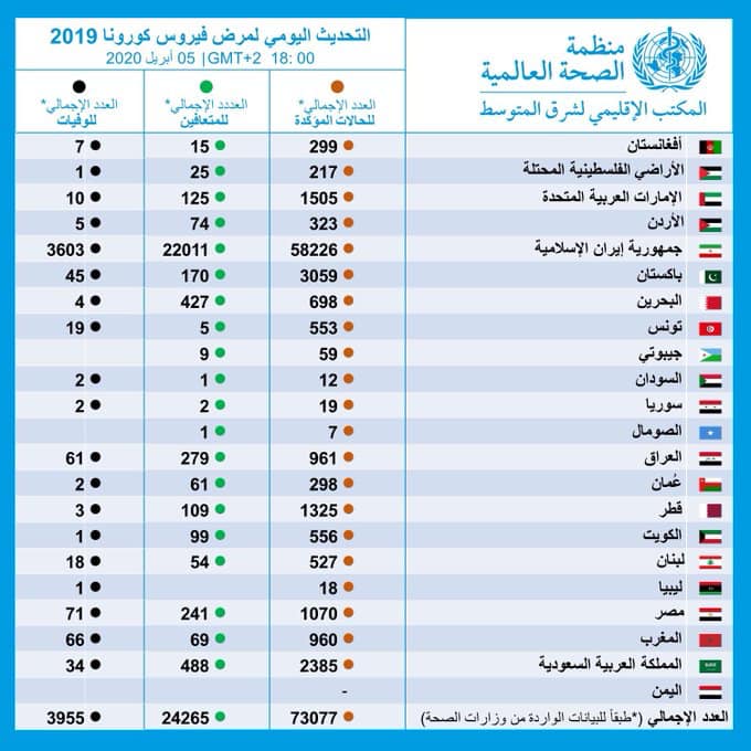 نشرت منظمة الصحة العالمية عبر مكتبها الإقليمي لشرق المتوسط، التحديث اليومي لمرض فيروس كورونا الذي يبيّن عدد الإصابات والمتعافين والوفيات لعدد من الدول من بينها اليمن.