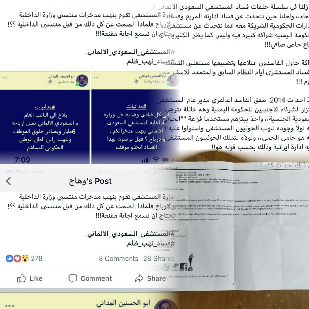 مزيد من التقارير الموثقة بالأسماء والارقام وبالتفصيل عمايحدث داخل اروقة المستشفى السعودي الالماني سيتم نشرها لاحقا وتباعا لتعرية الفساد والانتهاكات والنهب الذي يطال الكادر الوطني اليمني الذي يعاني مظلومية لامثيل لها ..
