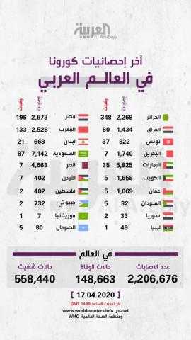 وفي آخر إحصائية لعدد المصابين بفيروس كورونا في الوطن العربي حسب العربية تتصدر المملكة العربية السعودية ب7142 حالة إصابة وأكثر من ألف حالة تعافي و87 حالة وفاة حتى الآن.