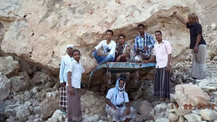 فجاه إذا بالصخرة آ تنقطع وكأنها قصت بمنشار.وتقع على الشاحنة المرفق صورتها .. فتهرسها آ ..