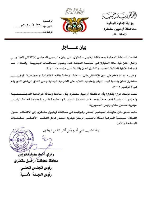 واعتبرت قيادة السلطة المحلية واللجنة الأمنية بمحافظة أرخبيل سقطرى في بيان صادر عنها تلقت وكالة الأنباء اليمنية "سبأ" نسخة منه، أن بيان ما يسمى بالانتقالي انقلابا على الشرعية اليمنية وعلى اتفاق الرياض الذي وقع في الـ 5 من شهر نوفمبر 2019م.