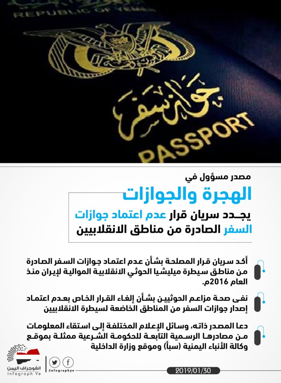 مصدر مسؤول يجدد سريان قرار عدم اعتماد جوازات السفر الصادرة من مناطق الانقلابيين