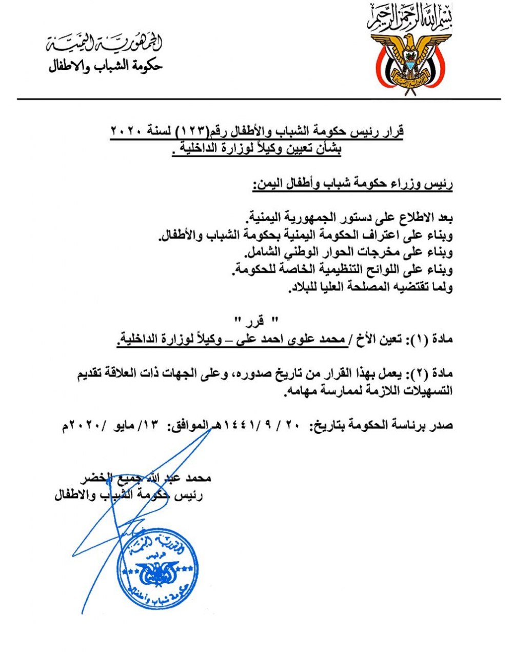 قرار رئيس حكومة شباب واطفال اليمن رقم (١٢٣) للعام ٢٠٢٠ م