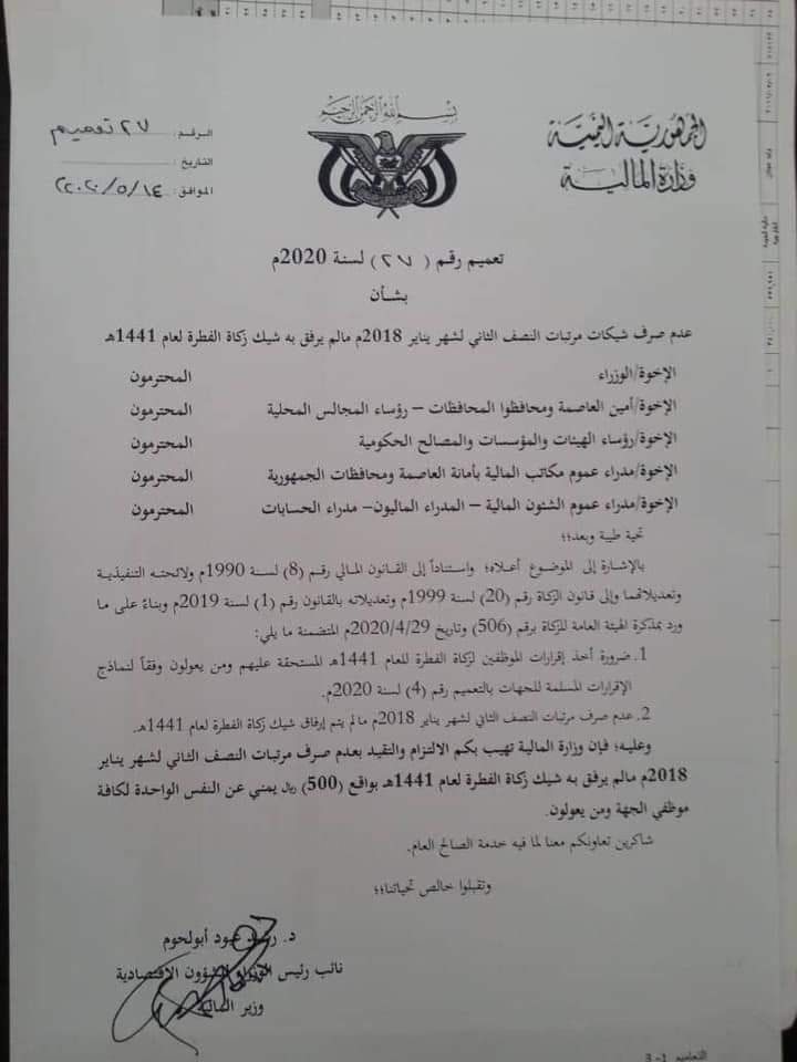 وتضمن التعميم ، الذي أصدرته وزارة المالية بحكومة المليشيا غير المعترف بها، توجيه كافة الجهات والمؤسسات في العاصمة صنعاء والمحافظات الواقعة تحت سيطرتها، عدم صرف شيكات "مرتبات النصف الثاني من شهر يناير 2018م" للموظفين، والذي من المقرر صرفه قبل عيد الفطر، ما لم يرفق بشيك زكاة الفطرة للعام الجاري1441هـ بواقع (500) ريال يمني عن النفس الواحدة لكافة موظفي الجهة ومن يعولون.