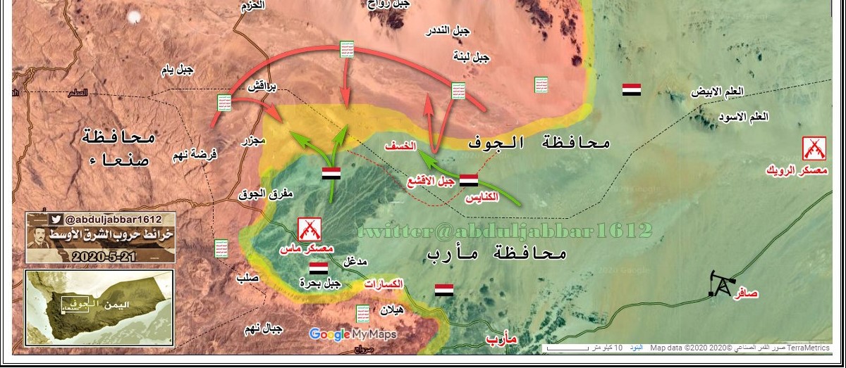 خريطة عسكرية تكشف عن استعادة الجيش الوطني مواقع في الجوف والالتفاف على مليشيات الحوثي.. شاهد