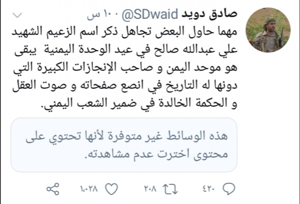 وقال العميد صادق دويد في تغريدة على صفحته بموقع التواصل الاجتماعي تويتر "مهما حاول البعض تجاهل ذكر اسم الزعيم الشهيد علي عبدالله صالح في عيد الوحدة اليمنية يبقى هو موحد اليمن".