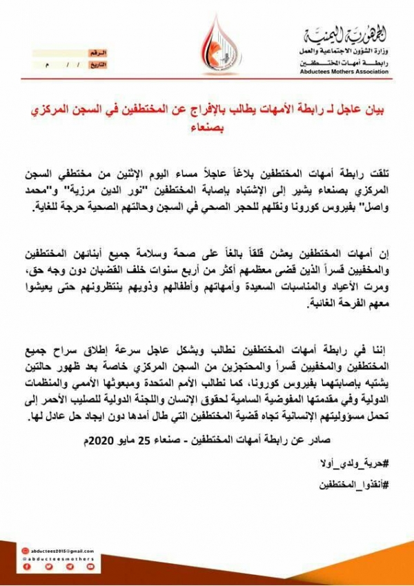 وطالبت رابطة أمهات المختطفين بسرعة إطلاق سراح جميع المختطفين والمخفيين قسراً والمحتجزين من السجن المركزي التابع للمليشات الحوثية.