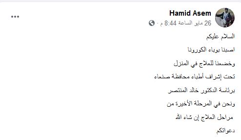وكشف حميد عاصم في صفحته بالفيسبوك عن اصابته بفيروس كورونا وخضوعه للعلاج في منزله من قبل اطباء بالعاصمة صنعاء .