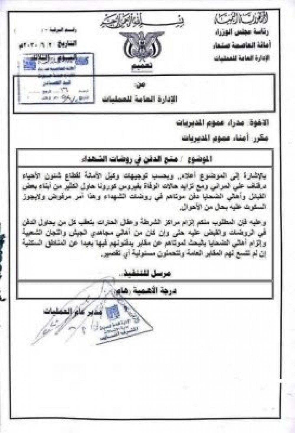 جاء ذلك في مذكرة رسمية وجهتها الإدارة العامة للعمليات بصنعاء الواقعة تحت سيطرة مليشيات الحوثي الانقلابية تتضمن توجيها صارمًا بمنع دفن الموتى في ماأسمتها “روضات الشهداء”.