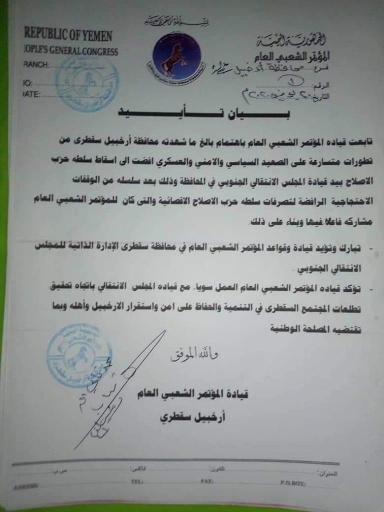 نفى مصدر مسؤول في قيادة المؤتمر الشعبي العام بجزيرة سقطرى صلته ببيان تأييد لخطوة سيطرة المجلس الانتقالي على جزيرة سقطرى.