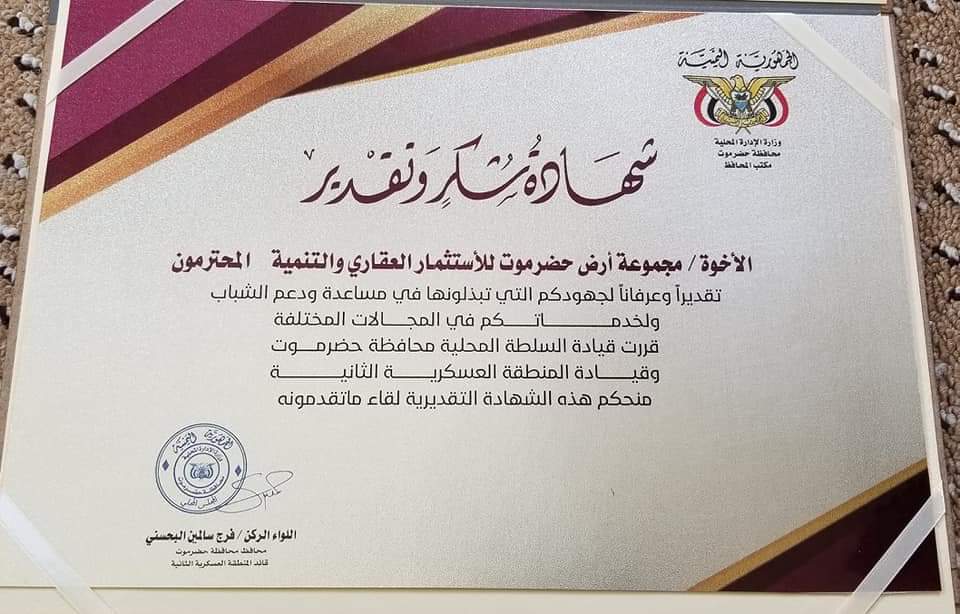 الجدير بالذكر أن مجموعة أرض حضرموت للإستثمار العقاري والتنمية قد قدمت في وقت سابق قطعة ارض ضمن مخطط البهجة السكني بمنطقة مريمة دعما منها لاتحاد الملتقيات الشبابية التطوعية بوادي حضرموت.