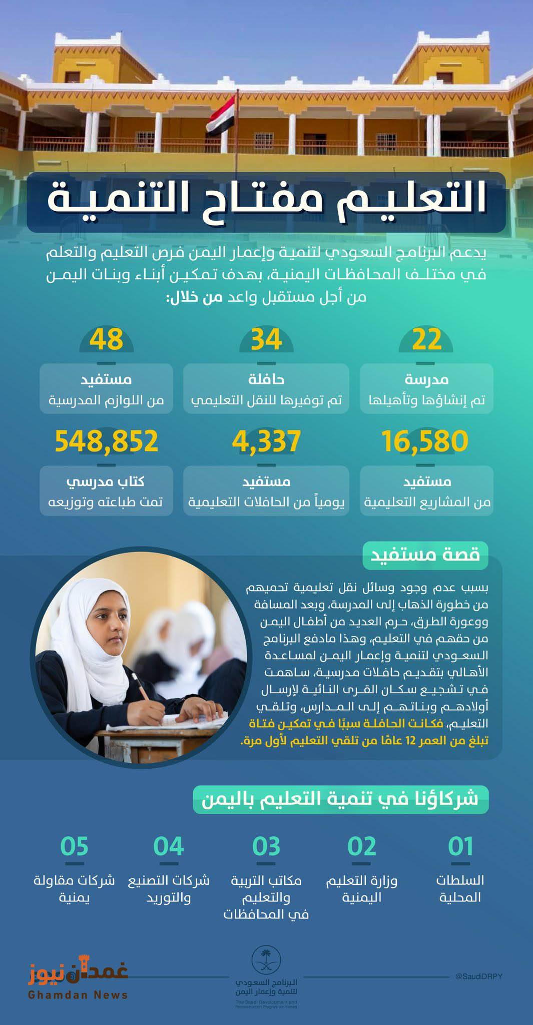 وبرز من مشاريع البرنامج السعودي لتنمية وإعمار اليمن مشروع مدينة الملك سلمان التعليمية والطبية في محافظة المهرة، الذي يعد أحد المشاريع التعليمية العملاقة في اليمن ويجرى حاليًا الانتهاء من التصاميم والمخططات الإنشائية لاعتماد ترسية المشروع الذي يتكون من جامعة أكاديمية تضم عددًا من الكليات العلمية والأدبية تسهم في تأهيل الطلاب في عدد من التخصصات التي يحتاجها سوق العمل والمجتمع اليمني، إضافة إلى مستشفى جامعي بسعة 300 سرير، يخدم أبناء محافظة المهرة.