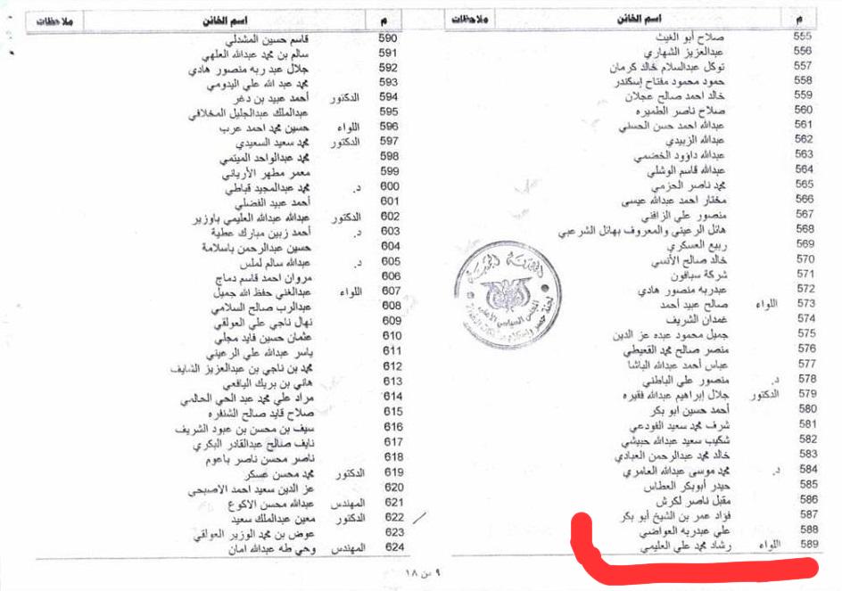 وأكد الوثائق التي ظهر فيها اسم الدكتور رشاد العليمي على قائمة المطلوبين للميليشيا الحوثية أن الدكتور رشاد يعمل جاهدا لخدمة المشروع الوطني في تاسيس الدولة الاتحادية ورفض الانقلاب وعمل جاهدا على تاسيس الائتلاف الوطني للأحزاب السياسية مع دولة الدكتور أحمد عبيد بن دغر وقادة الأحزاب الأخرى ويعمل جاهدا على وحدة الصف المؤتمري وهو الأمر الذي عرضه لحملات ممنهجة لتشويه صورته وسمعته وتاريخه النضالي.