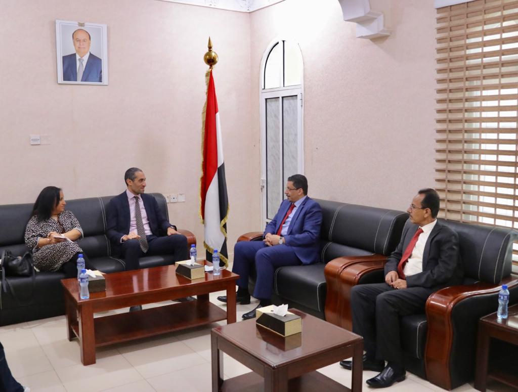 التقى وزير الخارجية وشؤون المغتربين الدكتور احمد عوض بن مبارك اليوم الإحد، مدير عمليات منظمة نداء جنيف، هشام خضراوي، ومدير المنظمة في اليمن، دينا المأمون.