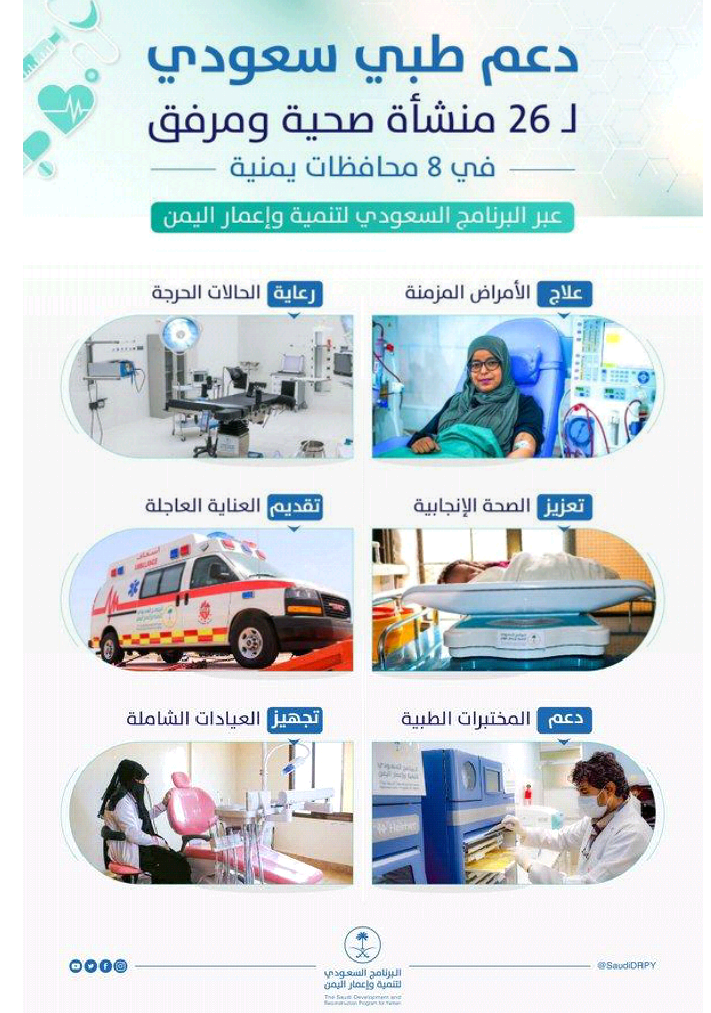وكان للبرنامج السعودي لإعمار اليمن دور في دعم القطاع الطبي بمحافظة مارب، من حيث توفير تجهيزات طبية لأكبر 3 مستشفيات بالمحافظة، وتوريد وتوفير معدات الرش مع المواد الازمة لمكافحة البعوض.