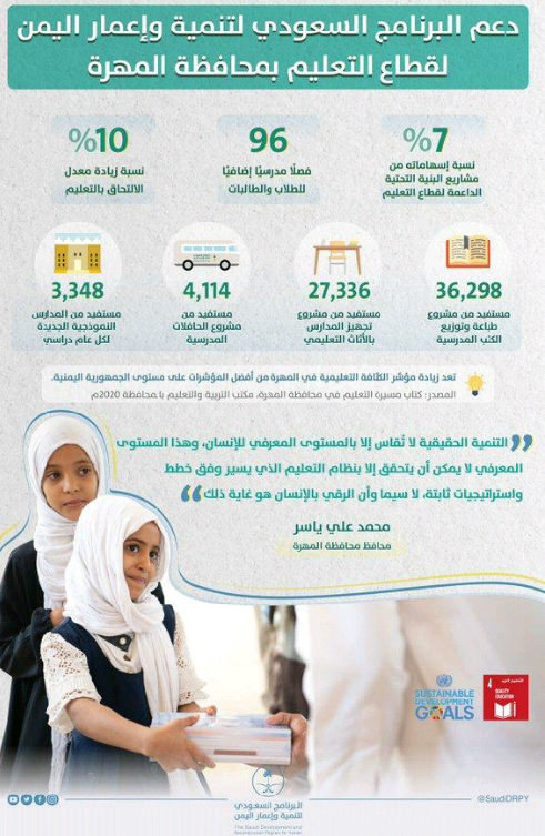 وتفصيلاً للمشاريع التي نفذها البرنامج السعودي في محافظة المهرة بالأرقام، مقسمة على القطاعات المستهدفة، نذكرها في الآتي؛