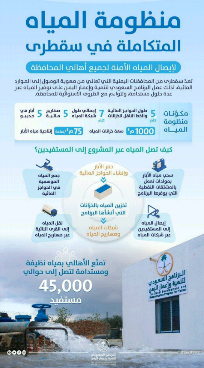 تعرضت جزيرة أرخبيل سقطرى عذرًا اليمن لتسونامي عام 2020م، وتدمرت فيها البنية التحتية من لم يلاحظ تلك الصور لفرسان ميدان لبرنامج السعودي وهم يقفون جنب الى جنب مع ابناء الأرخبيل ويشدون من آزرهم ويقدمون المساعدات العينية والنقدية لابناء الأرخبيل وإنشاء جسر جوي بين الرياض والأرخبيل مما خفف المعاناة غير المشاريع الخدمية التي قدمها حيث افتتح البرنامج السعودي لتنمية وإعمار اليمن، في يونيو 2020 آآآآآ حزمة من المشاريع التنموية في محافظة سقطرى، شملت مشروعاً لدعم الطاقة بالمحافظة عبر إنشاء وتنفيذ وتشغيل محطتي توليد الكهرباء في "حديبو" و "قلنسية"، ومشروعاً لإنتاج وإدارة الموارد المائية.