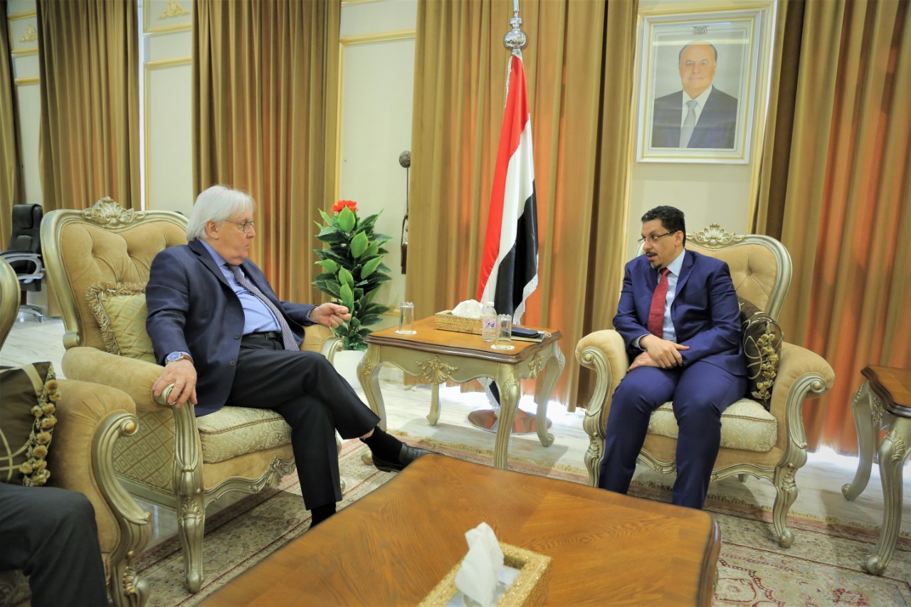 ناقش وزير الخارجية وشؤون المغتربين الدكتور أحمد عوض بن مبارك، اليوم، مع المبعوث الخاص للأمين العام للأمم المتحدة مارتن غريفيث، آخر التطورات على الساحة اليمنية والجهود الدولية الرامية لإيقاف الحرب وصولا الى تحقيق السلام الشامل والدائم، وفقا للمرجعيات المتفق عليها.