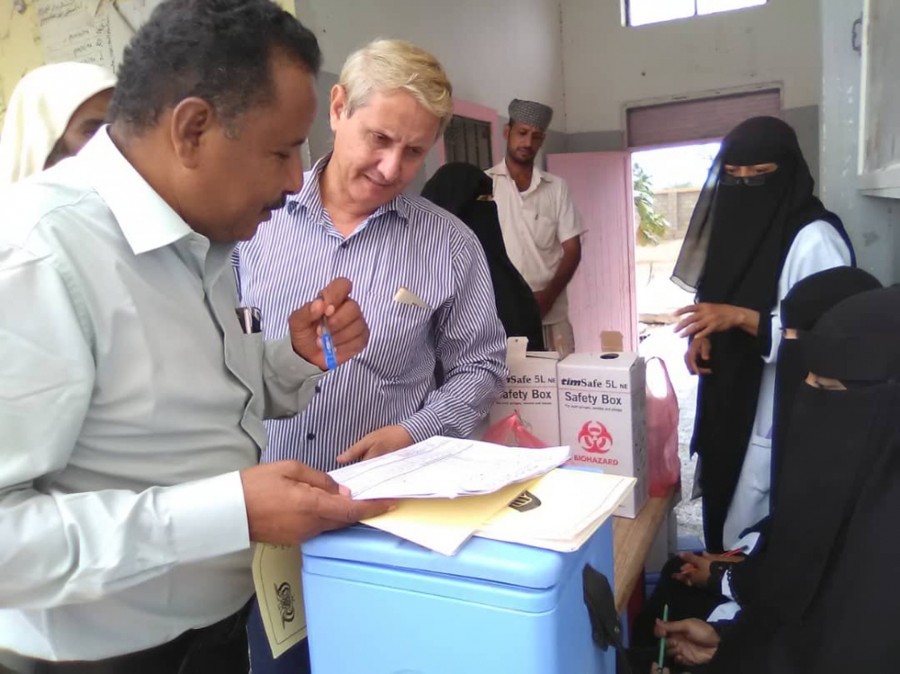 مدير عام مكتب الصحة والسكان بلحج ومدير التحصين يتفقدان سير عمل فرق التحصين. في مديرية تبن